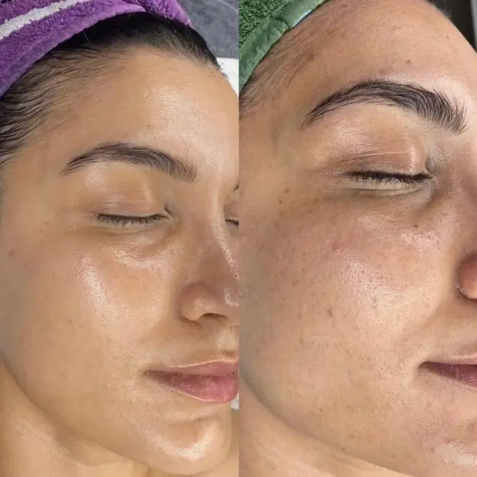 Diagnostic de la peau et application du traitement Line Repair, offrant une hydratation et un nettoyage profond de la peau.